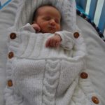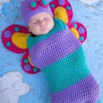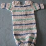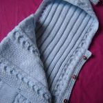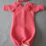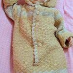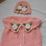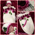 Yine aynı tarzda beyaz olarak örülen bu sefer dolgu olarak örülmüş ve mor lila ve pembe çiçeklerle süslenmiş farklı bir modelde uyku tulumu..