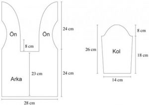 KOLLAR: İki kol içinde aynı anlatım uygulanacaktır, kolları örmek için 32 ilmek çekilerek başlanır ve 5 diş haraşo modeli örülür, Örgüye 4 sıra düz örgü, 3 diş haraşo modeli, 4 sıra düz örgü, 3 diş haraşo modeli, 4 sıra düz örgü, 3 diş haraşo modeli, …. şeklinde devam edilir. Her iki taraftan da 5 sıra ara ile 4 defa 1 er ilmek artış yapılır ve toplam da 40 ilmeğe ulaşılır. Kol boyu 18 cm örülerek kol evi için her iki taraftan 3+2+5 defa 1 er ilmek kesilir. Kol boyu 24 cm de kalan 20 ilmek her iki taraftan 4+4 şeklinde olarak kesilir. Şiş de kalan 4 ilmek ile bitirilir.