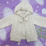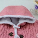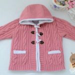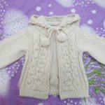 İkinci modelimiz de ise tasarım harikası yaratıcı bir kapşonlu hırka modeli var; beyaz renk ile örülen hırkamızda desen olarak yok yok…. fındık deseninden saç örgüsüne, kabartma modeline kadar bir çok örnek bu hırka üzerinde kendini gösteriyor. kapşon kenarından geçirilen uçları ponponlu kapşon bağı ise fındık modeli ile çok uyumlu olarak tasarlanmış. Kolları düz örgü modeli ile örülen hırkanın kolunun üst kısmında bir çizgi halinde aşağı inen delikli kabartma modeli yerleştirilmiş. Hırkamızda ki en dikkat çekici ayrıntılardan biri ve aynı zamanda hırkayı şirinleştiren unsur hırkanın arak etek kısmında yer alan kapalı yırtmaç modeli ve üzerine ayrıca örülüp dikilen file modelli etrafı açık mavi renk ile tığlanmış bir papyon. Modelimizin tüm anneler tarafından beğenileceğine eminim.