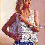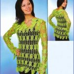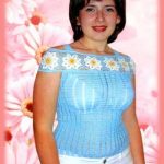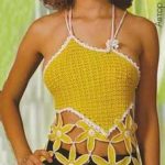 İlk modelimiz güneşin rengini büyük bir ustalık ile alan şık bir örgü bluz modeli; çift ip askılar ile omuzdan yukarı çıkan askılar, zik zak şekli verilmiş göğüs kısmı ve sarı papatya motifleri ile örülerek birleştirilen tunik uzunluğundaki etek kısmı ile muhteşem ve farklı bir tasarım gözümüze çarpıyor. Ana rengi sarı olan ancak beyaz renkli ip ile de kenarları tığlanan bluz modeli dikkat çekici güzellikte karşımızda duruyor.