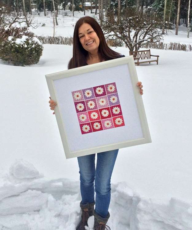 Mor çiçekli olan tabloda 270 adet yaprak motifi, 9 adet çiçek motifi, 15 tane ve 9 tane farklı tomurcuk motifi örülerek düzenlenen bambu çerceveli çiçekli tabloyu çok beğeneceğinizi düşünüyorum..