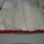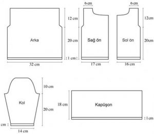 Ön+arka+ön şeklinde ilmekler tek şişe toplanır, beden boyu 30 cm e kadar örülerek diş haraşo örgü modeli örülüp, ilmekler bir defada kesilerek bitirilir. Sağ tarafta 6 cm arayla 4 adet ilik açılır.