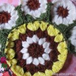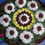 2.ci sırada köşe noktalarında 3 zincir ile oluşturup trabzan örüyoruz.Sonra açık yeşil ile 2 trabzan 3 zincir örerek motifin etrafını dolanıp motifi tamamlayın.