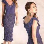 Tığ ile örülen mor, lila, beyaz, mürdüm, mavi tonlu üst kısım ve altı kısmı sadece beyaz olarak örülen örülen uzun elbise delikli olduğundan jupon giyilerek kullanılmış yasa içine astar dikilmiş..