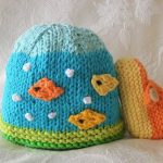 Şiş ile örülen düz örgü tekniği kullanılan balık motifleri dikilmiş hoş bir bere ve turuncu sarı haraşo örgülü patik modeli..