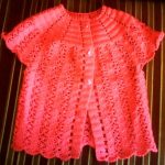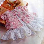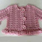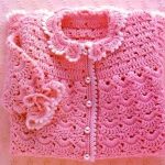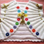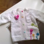 Beyaz bir hırka şiş ile örülmüş, üzerine tığ işi dal ve çiçekler işlenmiş..Yine beyaz olarak örülmüş güllerle süslenmiş fırfırlar dikilmiş hoş bir düğmeli hırka daha..