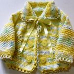 Akıllı ip ile örülen ve şiş kullanılan sarı tonlu düğmeli ve kurdeleli bir hırka örneği..