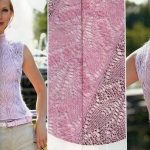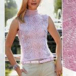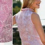 Ajur yaprak desenleri ile örülen ince iple şiş kullanılan toz pembe bayan triko yarım balıkçı ve kolsuz olarak dizayn edilmiş çok şık bir örnek olmuş..