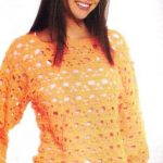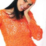 Turuncu olarak tığ ile örülen delikli bayan bluz modeli kollu içine penyeler giyerek kullanabilirsiniz..
