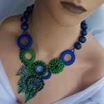 Saks mavisi yeşil bobin ipliği ile halkalara sık iğne olarak yapılmış boncuklarla detaylandırılmış kolye modeli şık ve biraz zahmetli..