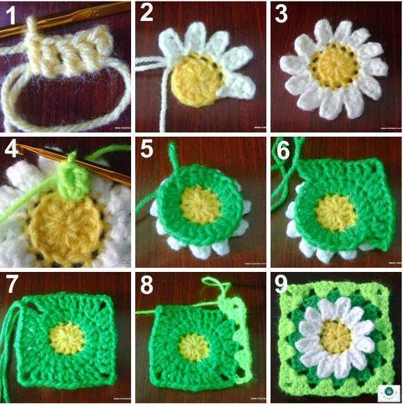 - 2.ci sırada köşe noktalarında 3 zincir ile oluşturup trabzan örüyoruz.Sonra açık yeşil ile 2 trabzan 3 zincir örerek motifin etrafını dolanıp motifi tamamlayın.
